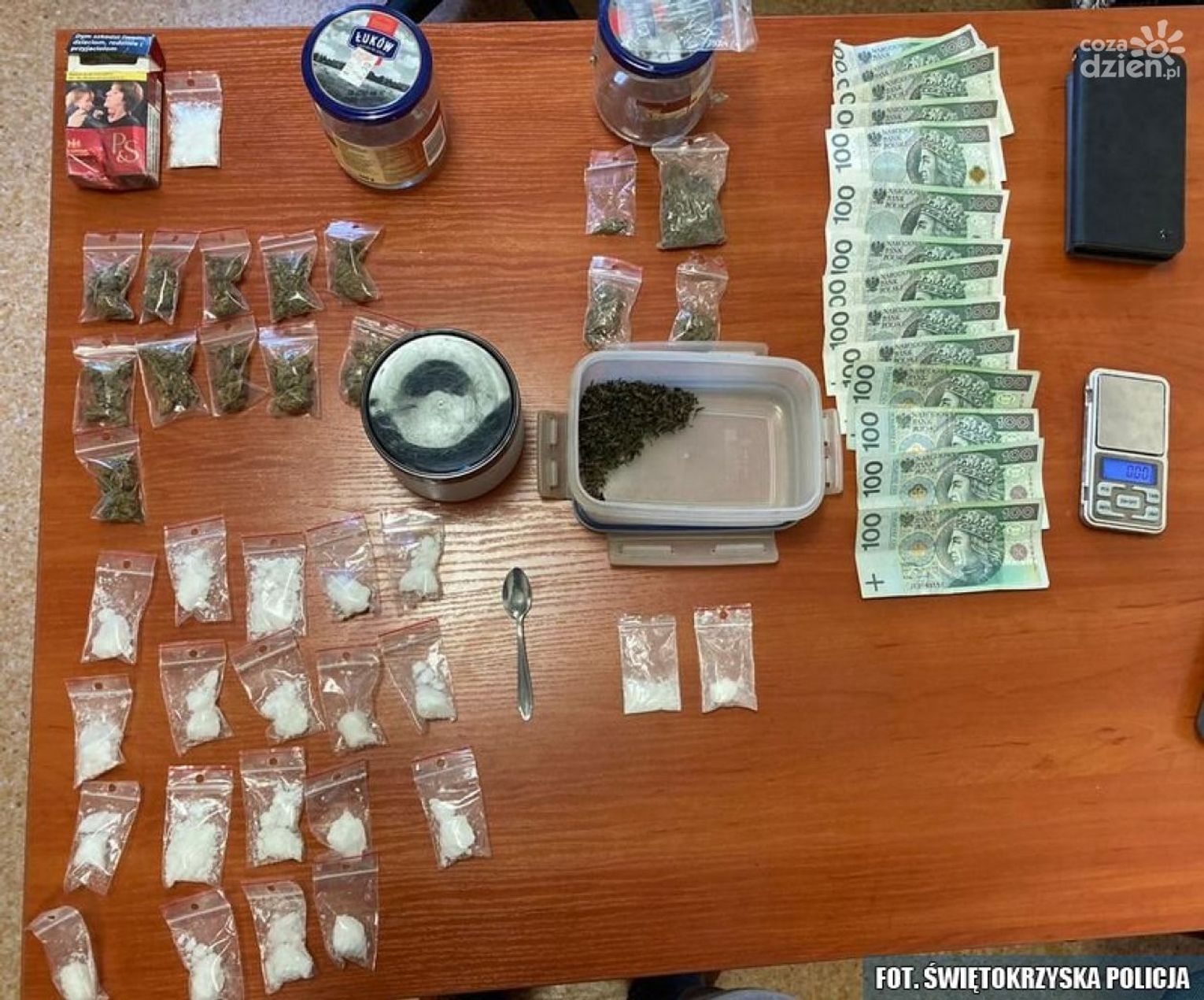 W miniony poniedziałek funkcjonariusze Wydziału Kryminalnego starachowickiej komendy na jednej z ulic w mieście napotkali 20-latka, którego od pewnego czasu podejrzewali o posiadanie narkotyków. W trakcie interwencji mundurowi znaleźli przy nim dwa zawiniątka z zawartością suszu roślinnego wstępnie zidentyfikowanego, jako marihuana oraz blisko 60 gramów amfetaminy. Kolejne czynności doprowadziły do zatrzymania wczoraj (środa, 20 stycznia) 41-latka, u którego w domu policjanci zabezpieczyli 100 gramów amfetaminy oraz 20 gramów marihuany. Ponadto funkcjonariusze zabezpieczyli pieniądze, wagę elektroniczną oraz dwa telefony.