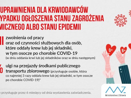 Od 26 stycznia br. obowiązują nowe przepisy określające przywileje dla krwiodawców. Są to zapisy ustawy o zmianie ustawy o szczególnych rozwiązaniach związanych z zapobieganiem, przeciwdziałaniem i zwalczaniem COVID-19, innych chorób zakaźnych oraz wywołanych nimi sytuacji kryzysowych oraz niektórych innych ustaw. Na ich podstawie każdy oddający krew lub osocze, ma prawo do zwolnienia z obowiązków służbowych na okres 2 dni (dotychczas – tylko w dzień donacji krwi). Krwiodawca, który 3-krotnie oddał krew lub osocze, ma prawo przez 6 miesięcy do 33-procentowej ulgi na przejazdy środkami transportu zbiorowego.