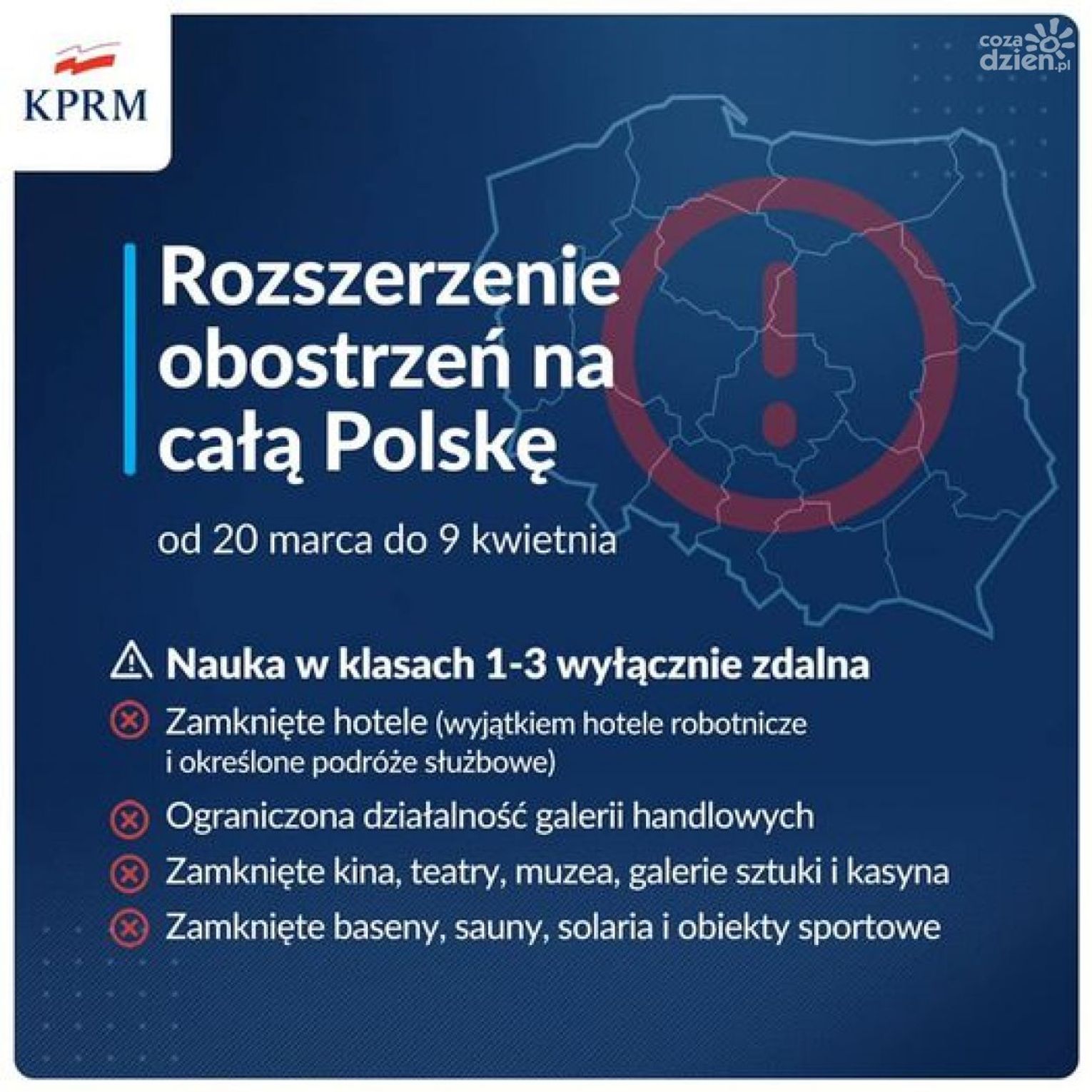 Od najbliżej soboty, 20 marca do 9 kwietnia, rząd wprowadza ograniczenia i obostrzenia w całym kraju. Uczniowie klas I-III przejdą na naukę zdalną. Zamknięte zostaną galerie handlowe, kina, teatry, baseny.