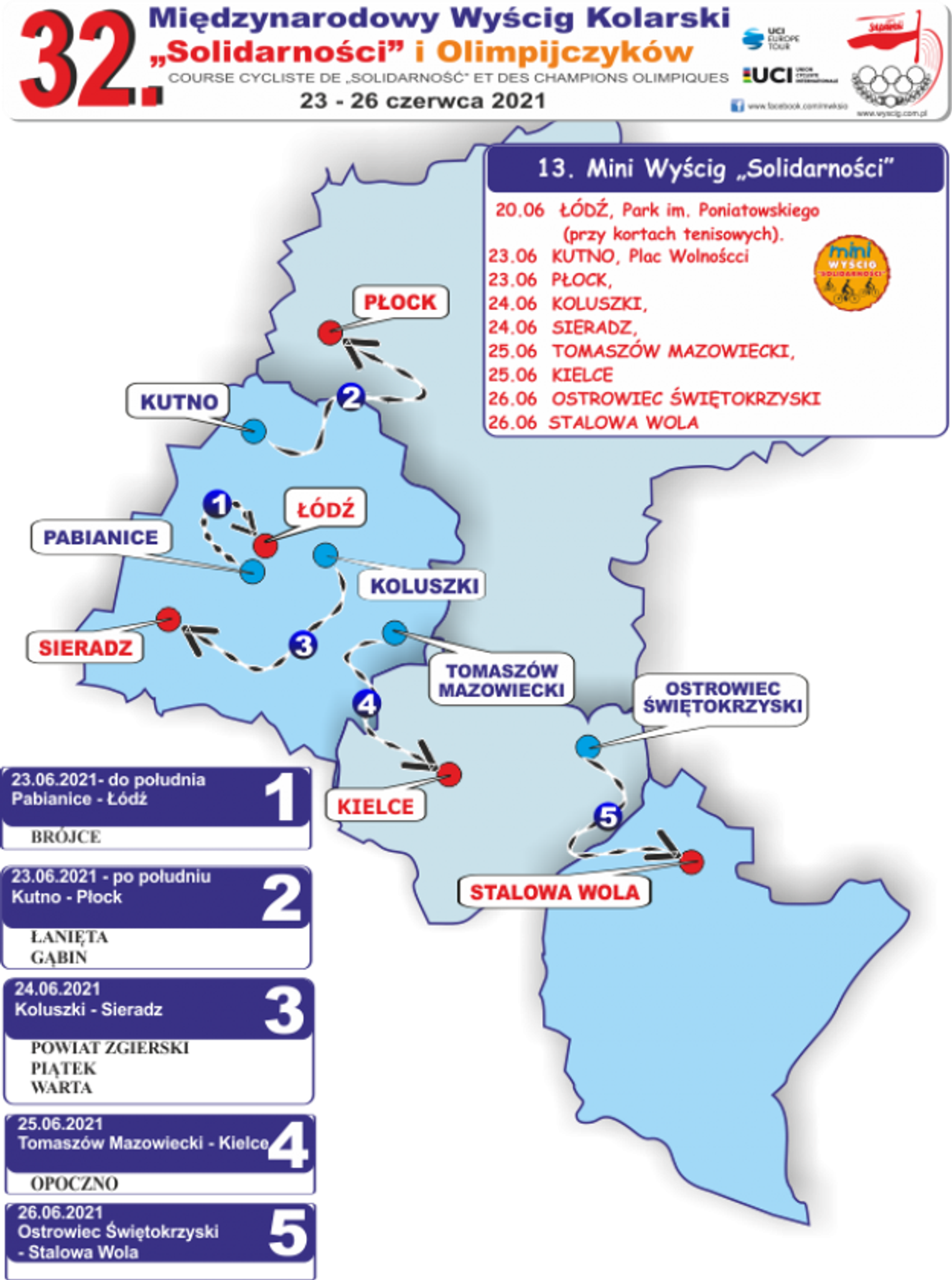 Tego dnia w naszym mieście ma być również zorganizowany wyścig dla przedszkolaków oraz uczniów szkół podstawowych 13 Mini Wyścig Solidarności. Przypomnijmy, że ten prestiżowy wyścig w przeszłości zwyciężali min. Tomasz Brożyna, Piotr Wadecki, Dariusz Baranowski, Łukasz Bodnar czy ostrowczanin Kamil Zieliński. W ubiegłym roku na starcie wyścigu stanęło 139 zawodników reprezentujących ekipy z kilkunastu państw a końcowym zwycięzcą okazał się Stanisław Aniołkowski z grupy CCC Development Team.