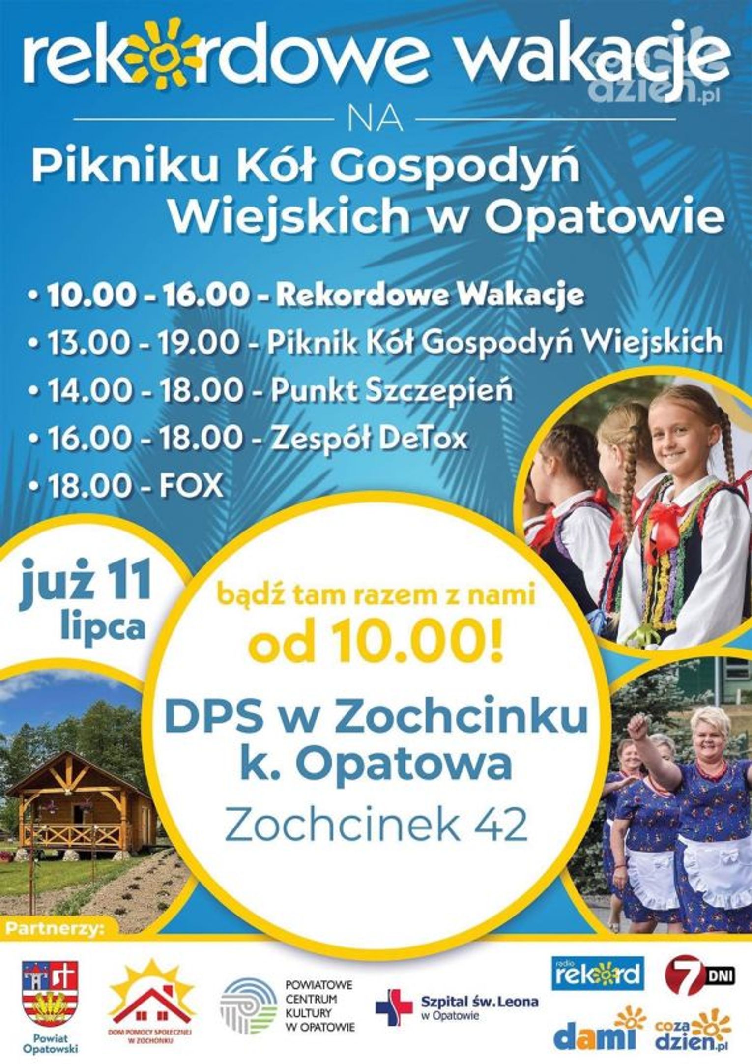 Piknik i Rekordowe Wakacje rozpoczną się w niedzielę w podopatowskim Zochcinku (tereny zielone przy Domu Pomocy Społecznej) już o godzinie 10. Przewidziano wiele atrakcji, przede wszystkim dla dzieci: dmuchane zjeżdżalnie, gry, zabawy. Po południu koncert zespołów DeTox i Fox. Oprócz tego, w godzinach od 13 do 19 zaprezentują się Koła Gospodyń Wiejskich z powiatu opatowskiego. Będzie można skosztować smacznych, lokalnych potraw.